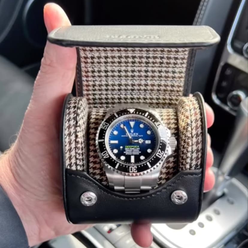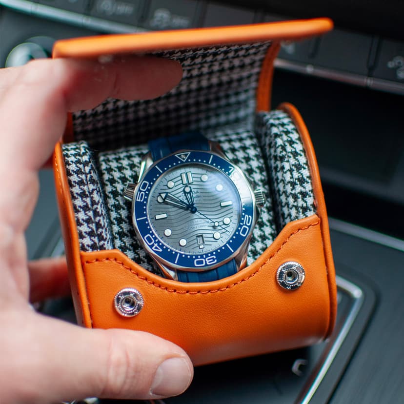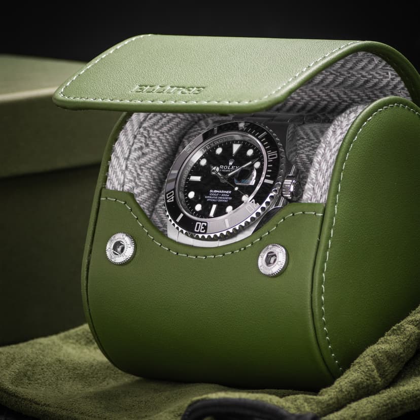 The watch roll is the perfect companion to my Tissot. The beautiful dark green leather complements the dial exceptionally well, as do the silver tones of the Herringbone interior, which nicely matches the brushed stainless steel watch bracelet. The roll feels premium in the hand and is exceptionally well-finished. The green stitching is immaculate throughout, and the case closes easily as the snap closures are precisely aligned. I really appreciate the subtle branding with the ELLIPSE logo pressed into the center of the roll, which allows the case to maintain its classy aesthetic. I would highly recommend this case!