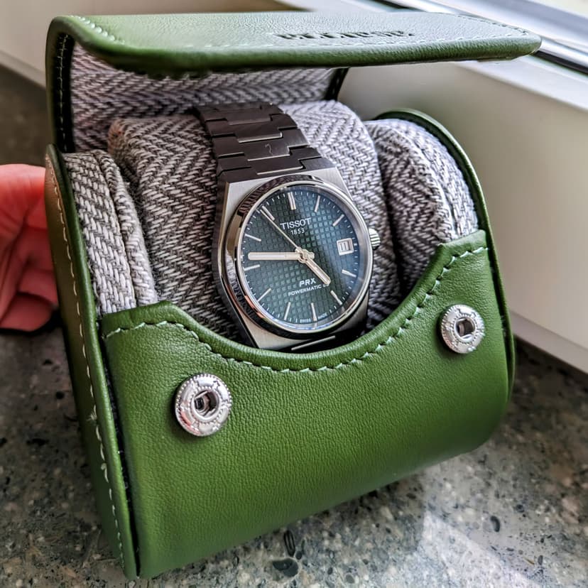 The watch roll is the perfect companion to my Tissot. The beautiful dark green leather complements the dial exceptionally well, as do the silver tones of the Herringbone interior, which nicely matches the brushed stainless steel watch bracelet. The roll feels premium in the hand and is exceptionally well-finished. The green stitching is immaculate throughout, and the case closes easily as the snap closures are precisely aligned. I really appreciate the subtle branding with the ELLIPSE logo pressed into the center of the roll, which allows the case to maintain its classy aesthetic. I would highly recommend this case!
